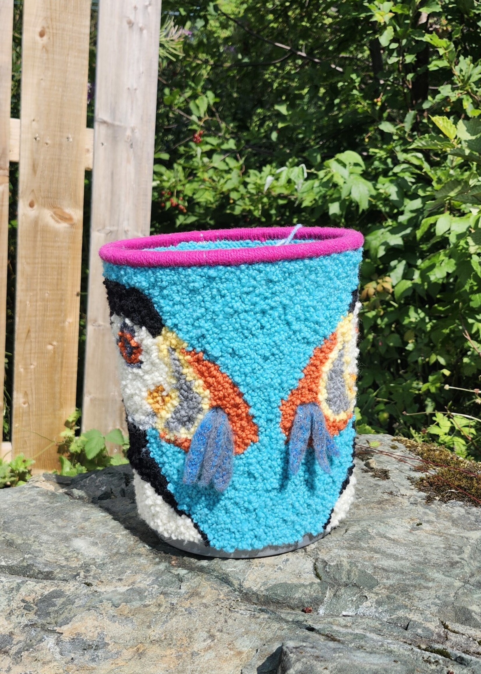 Hand hooked basket by Sandi Yates of Kings Point NL. This is a one kind piece of art! All hand hooked using Briggs and Little that includes COCO’s custom Bergy Blue.
